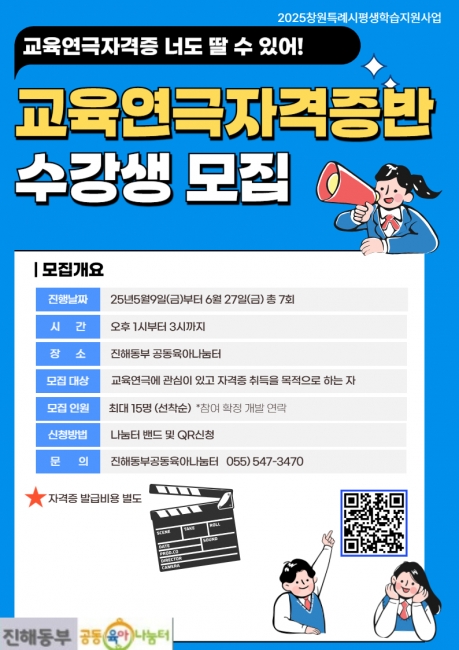 2025창원시평생학습동아리지원사업의 일환으로 품앗이양성과정으로 열리는 교육연극자격증반 마감이 얼마남지 않았습니다. 신청을 원하시는 분은 빠른 신청바랍니다. |