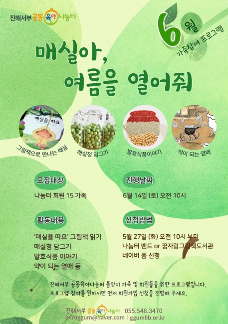 나눔터 소식 게시판 - <진해서부 공동육아나눔터>6월 가족 참여 프로그램 '매실아, 여름을 열어줘' 참가자 모집 안내