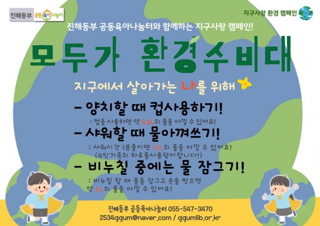 진해동부 공동육아나눔터에서는 2024년에 이어 2025년에도 지구사랑 환경 캠페인을 진행합니다. 6월 동부나눔터에서 시작되는 소소한 지구사랑 함께 실천해주세요. 항상 지구사랑 아이사랑을 실천하는 동부나눔터가 되겠습니다. |