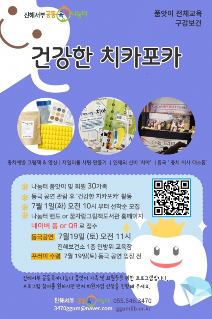 ***동극공연 관람과 '건강한 치카포카'활동이 하나의 프로그램입니다***** <프로그람 신청하기> #진해서부공동육아나눔터 #동그라미공연단의빛나는동극공연 #충치예방교육 #건강한치카포카 #공연도보고꾸러미도받고 |