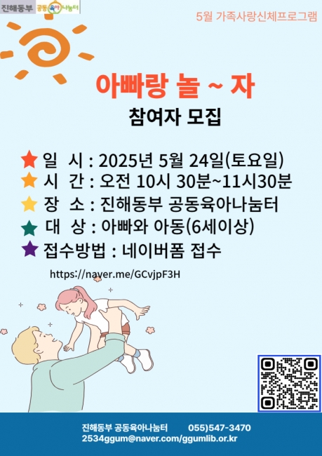 나눔터 소식 게시판 - [진해동부 공동육아나눔터]5월가족사랑신체프로그램 (아빠랑 놀~자)참여자 모집