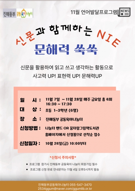 11월 언어발달프로그램 '신문과 함께 하는 NIE 문해력 쑥쑥' 참여자를 모집합니다. 초등 저학년을 대상으로 하며 신문과 친해지는 시간이 될 것 입니다. 11월 7일부터 11월28일 매주 금요일 16:30 ~ 17:30