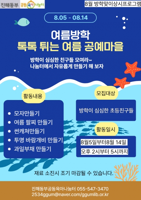 여름방학을 맞아 진해동부공동육아나눔터에서 톡톡 튀는 공예마을 상시프로그램을 진행합니다. 방학이 심심한 친구들 오세요 모자도 만들고 부채도 만들고 예쁜 선캐쳐 팔찌 만들어보아요 재료 소진시 조기 마감이 될 수 있습니다. 그럼 8월에 만나요 |