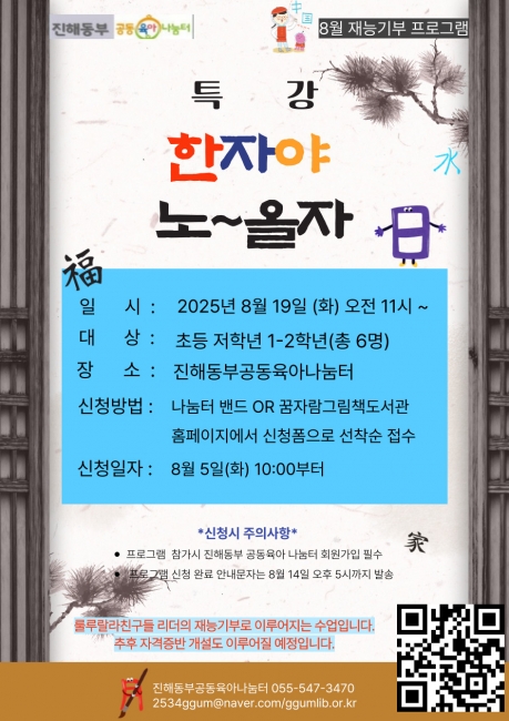 진해동부공동육아나눔터에서는 여름 방학을 맞이하여 '한자야 노~올자' 특강 프로그램을 마련하였습니다. 일시 : 2025년 8월 19일 (화) 오전 11시부터 장소 : 진해동부공동육아나눔터 대상 : 초등 1-2학년 6명 (선착순)