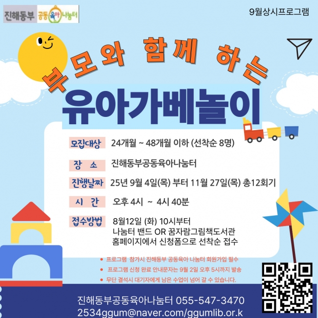 9월 상시프로그램 부모와 함께 하는 유아가베놀이 참여자 모집안내 - 프로그램 신청 : 8월 12일(화) 신청폼으로 접수 - 모집인원 : 나눔터 회원 24개월에서 48개월 유아와 부모(선착순 8명) 현재 품앗이 활동을 하는 분들 먼저 기회가 제공됩니다. - 참가비 : 무료 - 활동일정: 2025년 9월 4일 (목)부터 11월 27일(목)까지 -활동시간 : 오후 4:00-4:40 - 활동장소 : 진해동부공동육아나눔터 ※ 프로그램 이용규칙 해당 거주지에 가입된 나눔터에서 이용가능해요.(비회원은 회원가입후 이용가능.) 제출된 사진은 홈페이지 및 외부홍보(언론 등)에 이용될 수도 있습니다. 프로그램 신청 완료 안내문자는 9월 2일 오후 5시 발송해드려요 무단 결석시 대기자에게 남은 수업이 넘어 갈 수 있습니다.